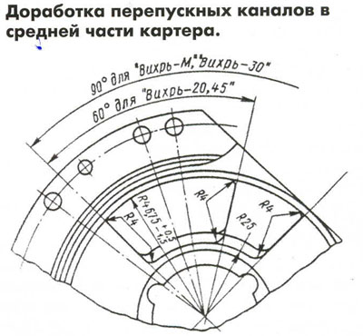 Однако в средних частях картера необходимо доработать овальные перепускные каналы, уменьшив их до угла 60°, т.е. сделать такими, какими они были на первой модели "Вихря".