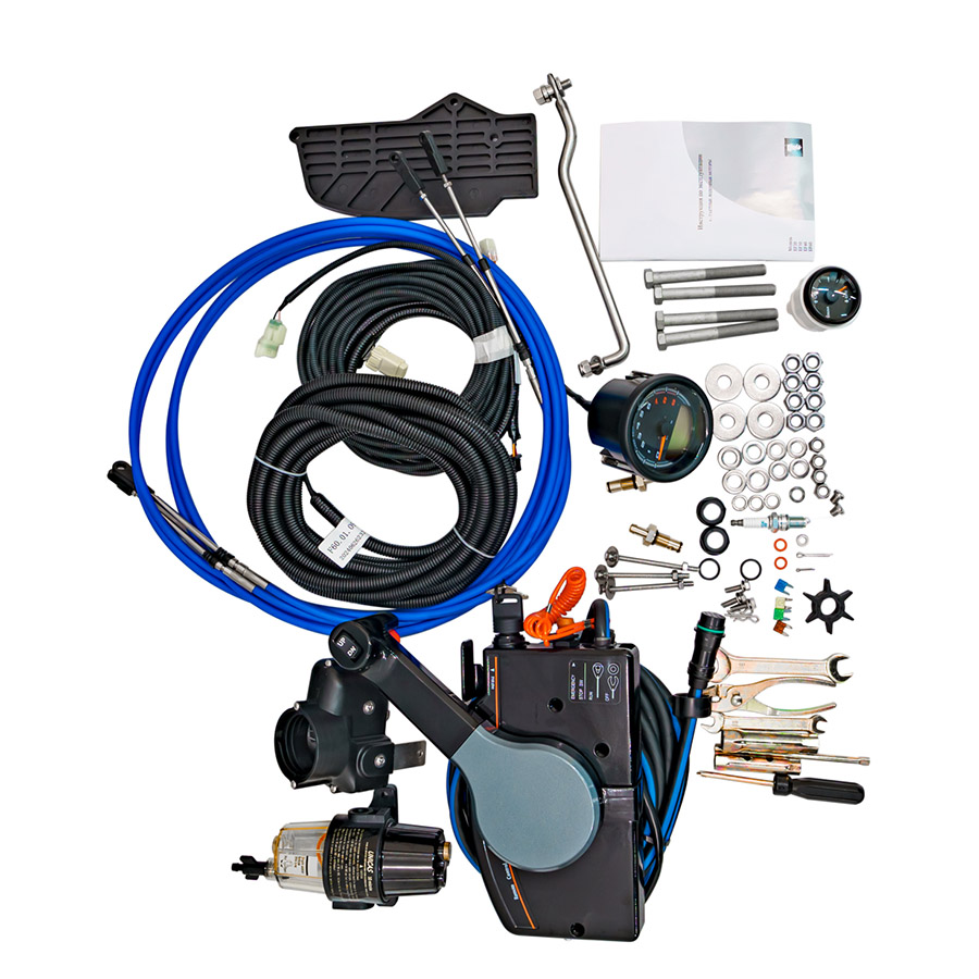 Все, что нужно, находится в коробке с двигателем, а именно: рулевая тяга и дистанционное управление с необходимыми тросами и комплект крепежа.