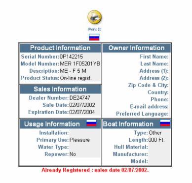 Мотор F5М 0p142215 мощностью 5л.с. был продан 02.07.2002 года.